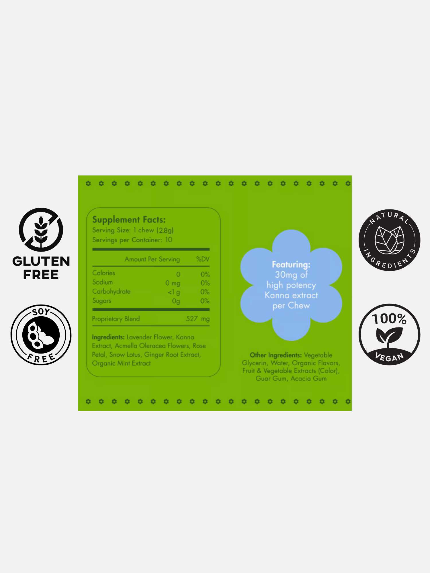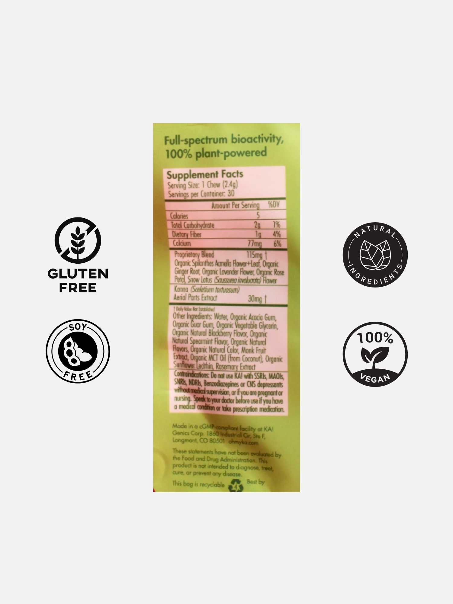 Each Chew contains 30mg of standardized, high potency Kanna extract.