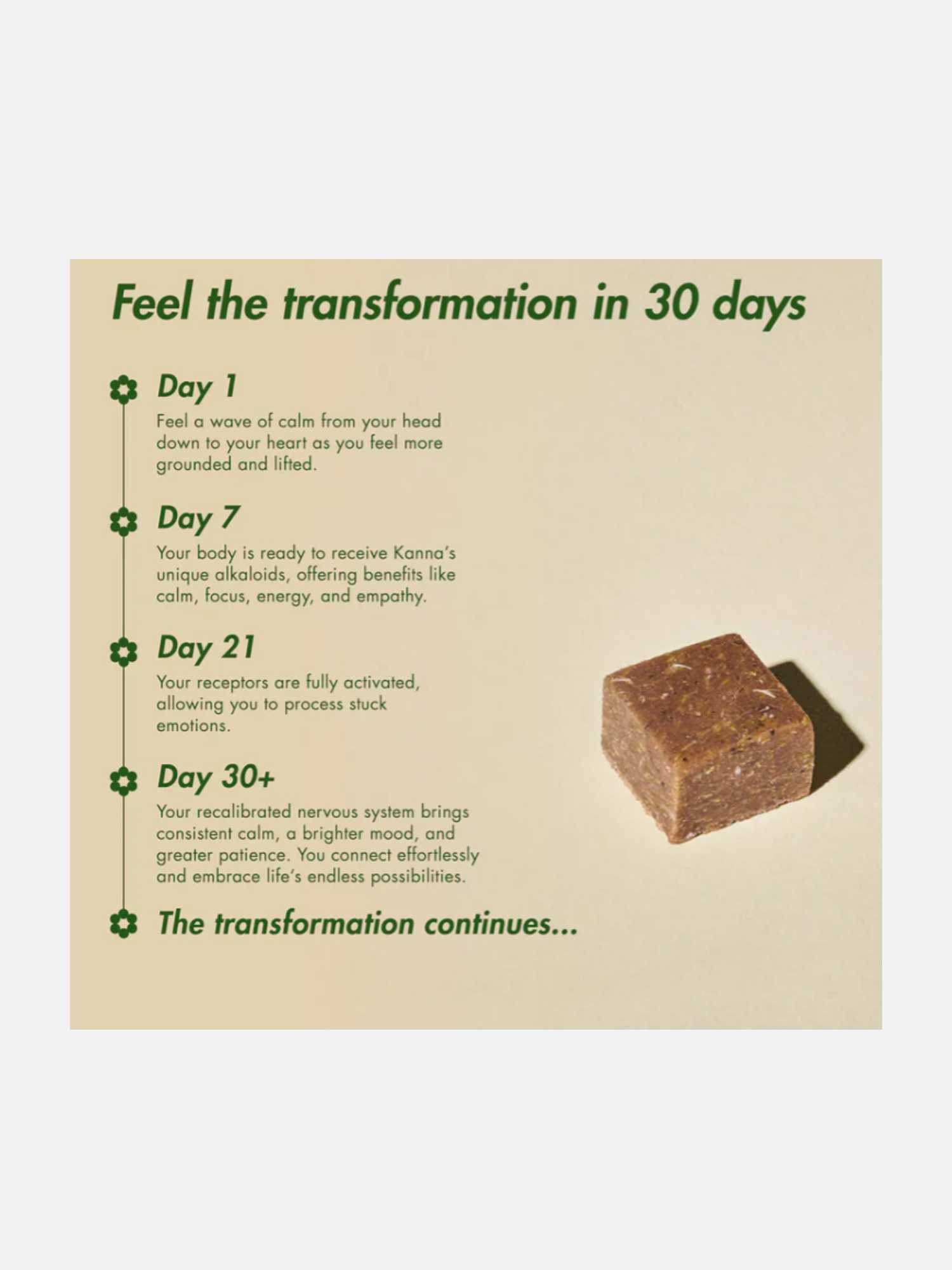 KA’s Daily Chews are made by hand using 100% botanicals featuring Kanna, a mood-enhancing plant from South Africa. Kanna has been clinically proven to calm stress*, improve focus and activate an immediate sense of grounded energy, helping people feel more alive, connected and capable. KA! Kanna Chews are patent-pending and formulated for maximum neuroprotective, feel-good and immune boosting benefits.